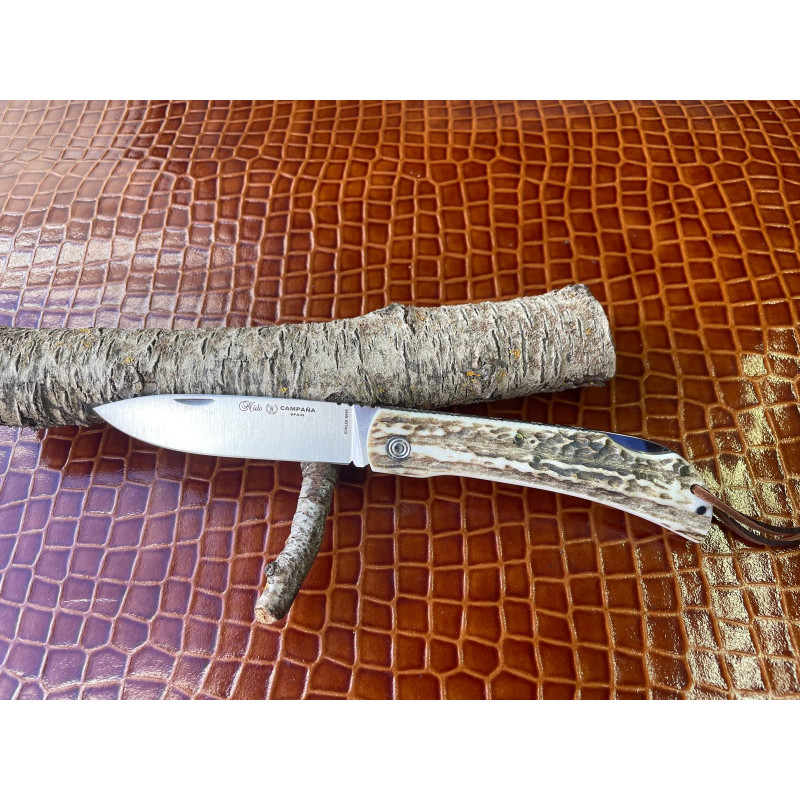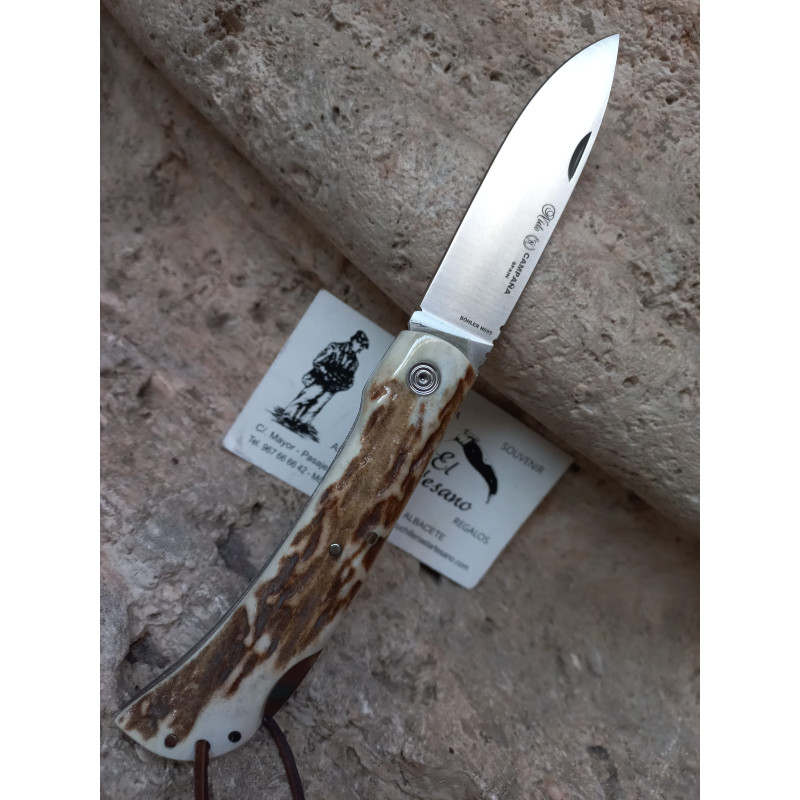 160CIERVO Navaja de nieto campaña con hoja de acero bohler 695, mango de ciervo, muelle trabajado en artesanía, tamaño de hoja de 9 cm, grosor de hoja 3 mm, sistema de cierre de bloqueo, con cordón fiador.