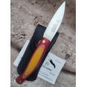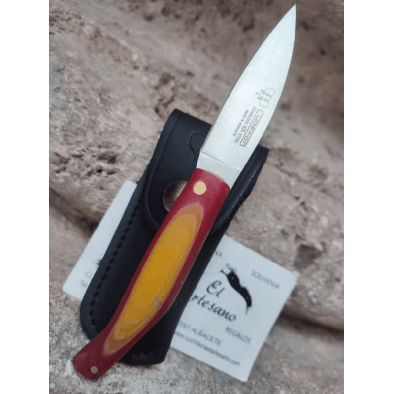 444-BEF Navaja campera Cudeman. Hoja de acero 420; dureza del acero: 50/52 hrc; longitud de hoja: 8 cm; longitud de mango: 10 cm; longitud total: 18 cm; grosor de hoja: 2 mm; sistema de cierre: pistón; anclaje del mango: remache de latón plano; mango: bandera de España en mikarta pulida. CON FUNDA DE CUERO