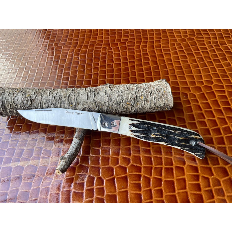 Exclusiva navaja Nieto Buckler, hoja de acero Böhler N-690 cobalto con uñero, mango de hueso de ciervo con virola de acero , sujeción con tornillos Allen, muelle en acero y forros pulidos, sistema de cierre de pistón forzado a 2 tiempos, tamaño de hoja 9 cm, tamaño de mango 10,5 cm., funda de la foto no incluida