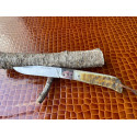 Exclusiva navaja Nieto Buckler, hoja de acero Böhler N-690 cobalto con uñero, mango de carnero con virola de acero , sujeción con tornillos Allen, muelle en acero y forros pulidos, sistema de cierre de pistón forzado a 2 tiempos, tamaño de hoja 9 cm, tamaño de mango 10,5 cm., funda de la foto no incluida