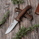 388-G Navaja de caza de Cudeman. Hoja de acero Bohler N690co; dureza del acero: 60/61 hrc; longitud de hoja 9,5 cm; longitud de mango 12 cm; longitud total 21,5 cm, grosor 3mm, ancho de pala 2,3cm, mango de madera de nogal con separadores rojos, con remaches de latón, peso navaja: 128 gr. extra: agujero para cordón fiador.