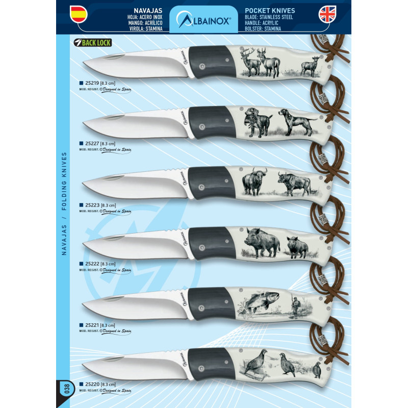25221 Navaja de caza con hoja de acero inox, mango acrílico con motivos de PESCA, virola de stamina, tamaño de hoja 8,3 cm, sistema de cierre de bloqueo trasero.