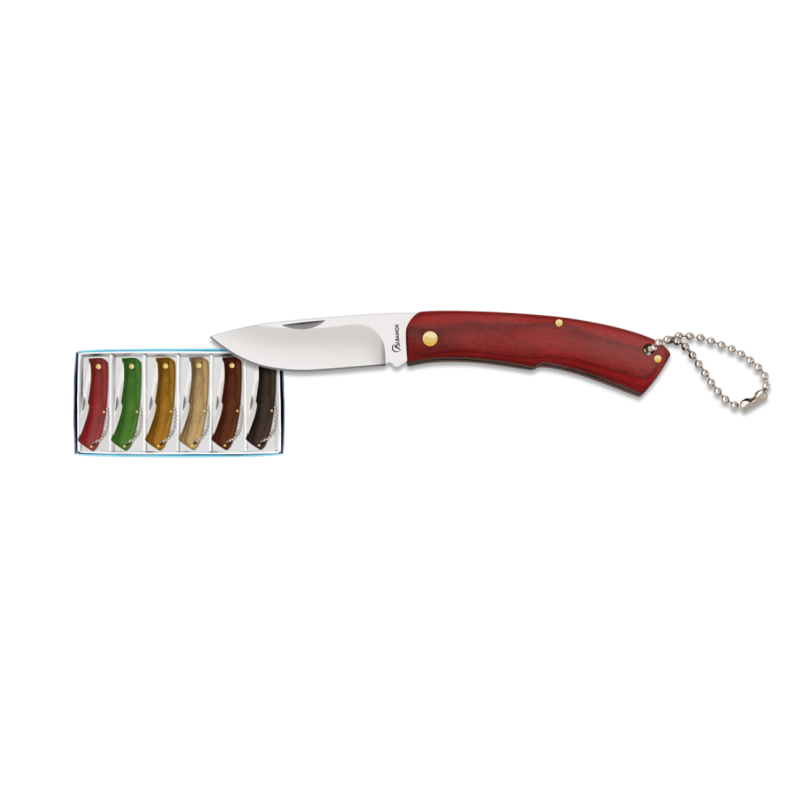 25361 Set 6 navajas de madera en varios colores, hoja de acero inox, sistema de cierre de pistón, tamaño de hoja 7,1 cm.