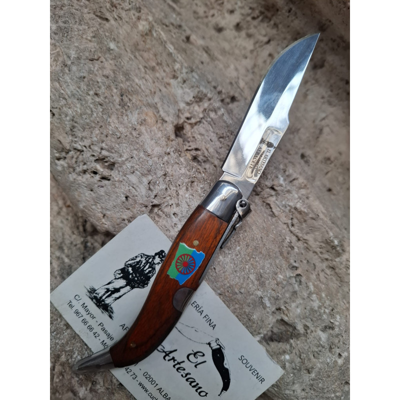 01163+UM21 Navaja teja con carraca grabada a color con la bandera gitana, hoja de acero inox, virola de aluminio, mango stamina roja, tamaño de hoja 8,2 cm.