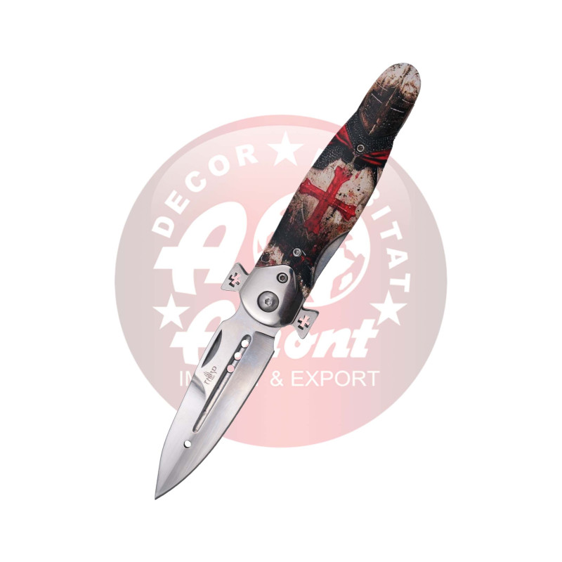 Navaja Third N120D, modelo Templario, virola de acero con cruzes acabado en brillo espejo, mango de madera de haya con imprimación 3D replicando un guerrero templario, hoja de acero inox acabado brillo espejo de 8,1 cm. Con caja de presentación. Ref. N120D