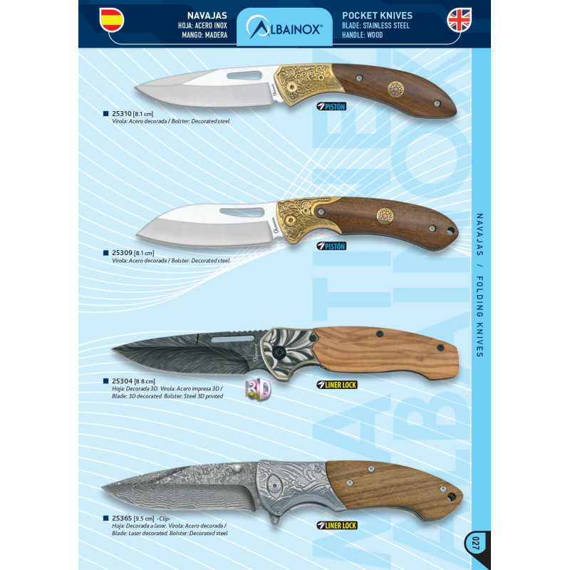 25304 Navaja con hoja de acero inox decorada en 3D, mango de madera, virola de acero impresa en 3D, sistema de cierre liner lock, tamaño de hoja 8,8 cm.