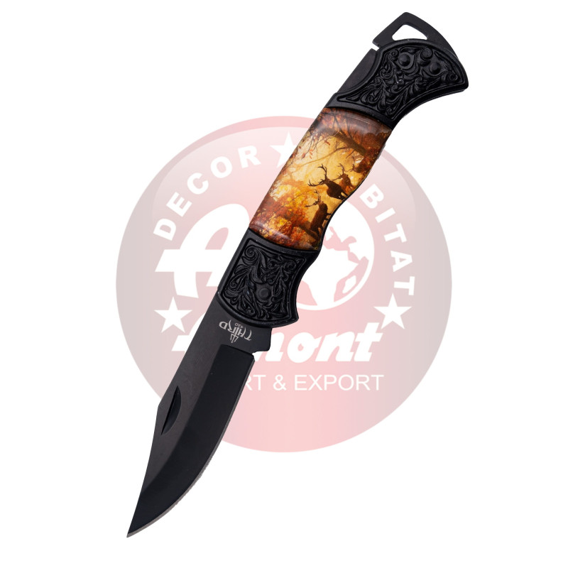Pack de 24 navajas Third N190C hoja de 7,5 cm acabado en negro, mango con virolas negras decoradas y fotografía de ciervos. Ref. N190C