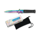 19836 Navaja RAINBOW con hoja de acero inox, baño de titanio, mango de aluminio, tamaño de hoja 8 cm. Sistema de apertura manual. Con funda de terciopelo y caja de presentación.