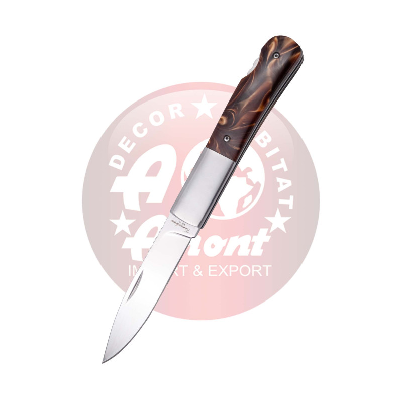 Navaja 108G de Tramuntana Knives N108D, mango con virola de acero inoxidable acabado en brillo espejo con acrílico ámbar, hoja de acero VG10 acabada en brillo espejo de 10,2 cm con decoración en la parte superior de la hoja, navaja de bloqueo trasero con el muelle decorado. Con caja de presentación. Ref. N108D