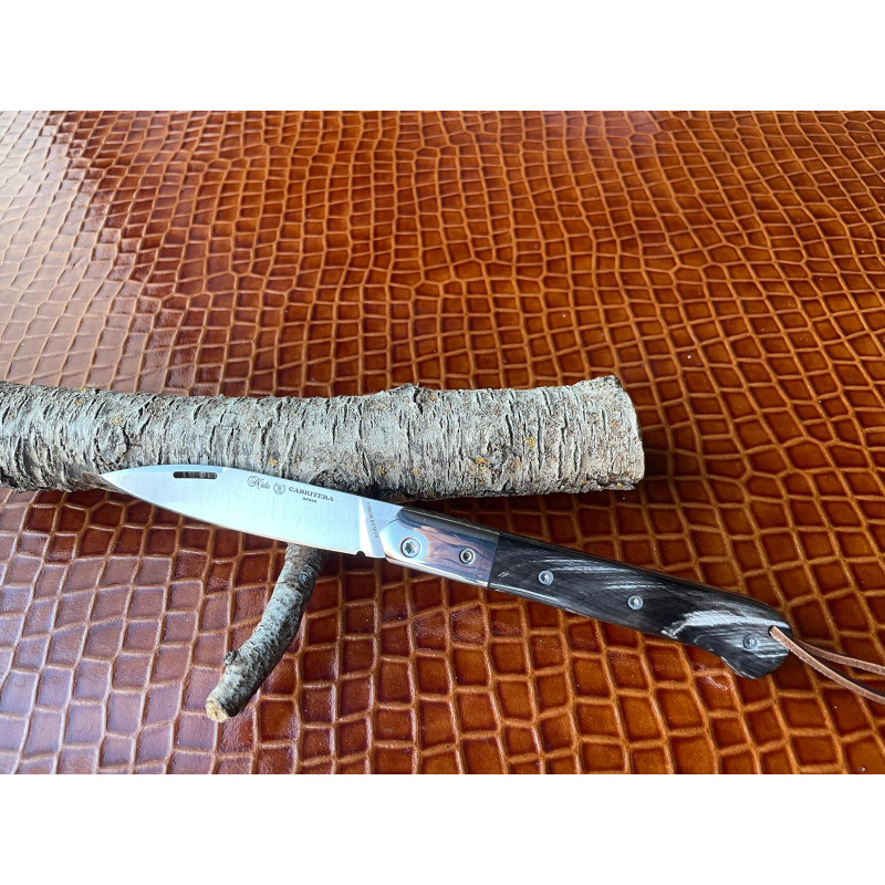 Novedad Navaja Nieto Cabritera en acero böhler N690 cobalto, virola de acero y cachas en búfalo de agua,con un cordón en la parte trasera tamaño de hoja 9,5 cm, tamaño mango 11,5 cm, sistema de cierre de pistón.