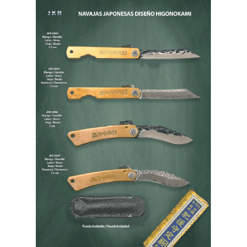JKR895 Navaja higonokami, hoja de acero damasco, mango en latón, tamaño de hoja 7,5 cm, con funda