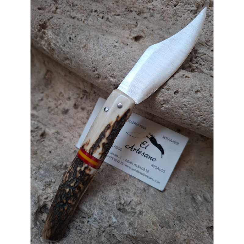 Navaja artesana todo hecho a mano , acero molibdeno vanadio , hoja clasica ,con uñero el mango ciervo con cintillo de España en el centro del mango , sin forros, sistema de cierre de fricción, tamaño de hoja 9cm, tamaño mango 12,5cm
