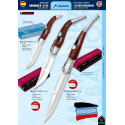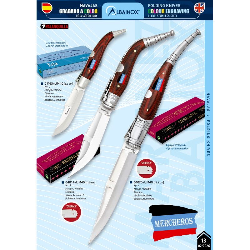 01163+UM40 Navaja teja con carraca grabada a láser con la bandera mercheros, hoja de acero inox, virola de aluminio, mango stamina roja, tamaño de hoja 8,2 cm.