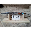 01070+UM40 Navaja serrana con carraca grabada a color con la bandera mercheros, hoja de acero inox, mango de stamina roja, tamaño de hoja 15,4 cm.