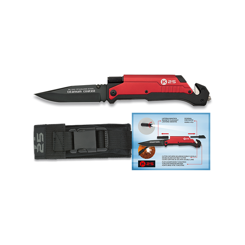 Navaja táctica K25, hoja de acero 7cr13mov con recubrimiento de titanio hoja filo , mango de aluminio negro y rojo, lleva una linterna en la parte superior y un pedernal, cutter para cortar cinturones y punta de tungsteno para romper cristales, sistema de bloqueo linerlock, tamaño de hoja de 9,5 cm y mango de 12,8 cm. Con funda de nylon y estuche de presentación.