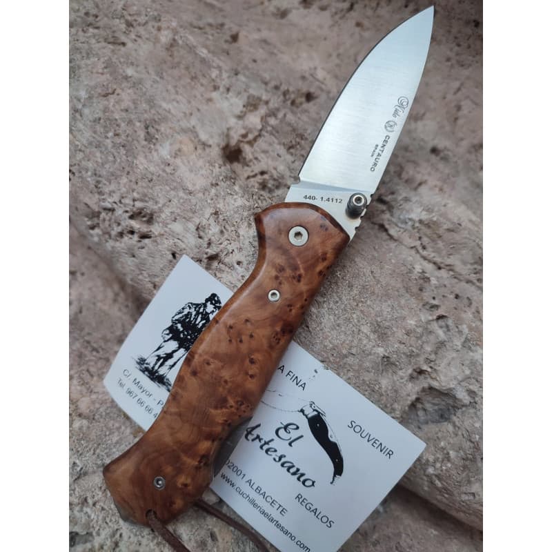 Exclusiva navaja Nieto CENTAURO diseñada por Manuel de la torre, hoja de acero bohler N690co, con tetón de apertura ambidiesta, mango de madera de tuya, sujeción con tornillos allen. muelles y forros pulidos a espejo, muelle trabajado, sistema de cierre de bloqueo, tamaño de hoja 7,8 cm, tamaño total 18,5 cm, precio de fábrica.