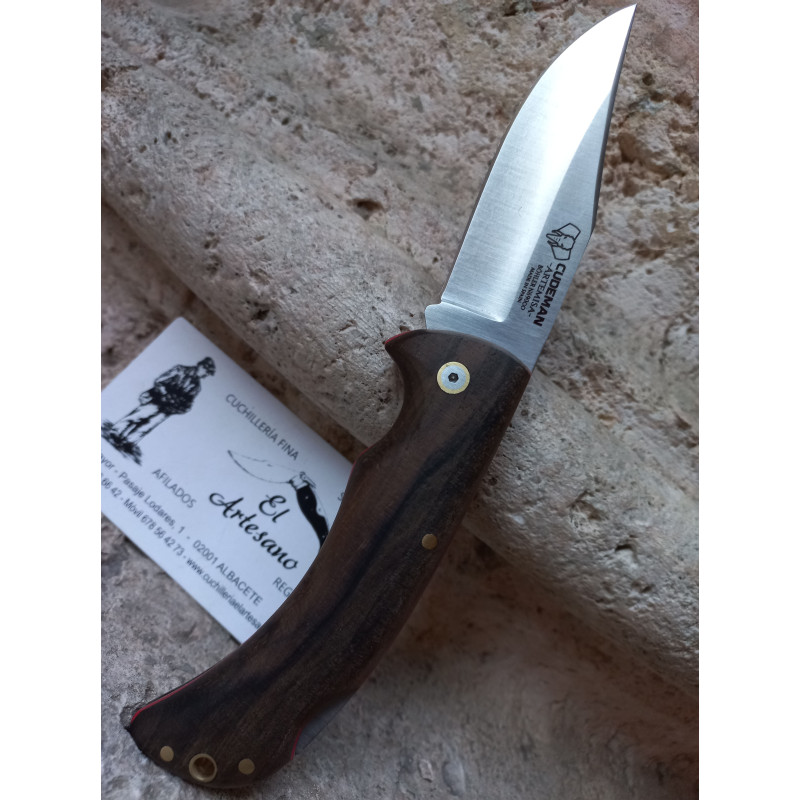 326-G Navaja de caza de Cudeman con hoja de acero Bohler N695; longitud de hoja 9,5 cm; longitud de mango 11,5 cm; longitud total 21 cm; grosor de hoja 3 mm; mango de madera de nogal pulido con separador rojo; peso navaja: 128 gr. extra: agujero para cordón fiador.