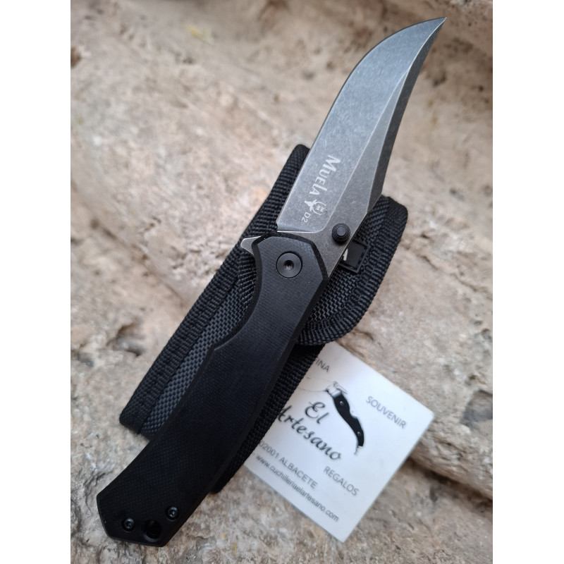 Navaja Vibora 10G, Muela,diseñado por Tommaso Rumici, acero D2 lavado a la piedra. con tetón ,sistema de rodamiento, dureza 55-60hrc, mango en G10 negro , tamaño de hoja 7,6cm, peso 82gramos, sistema de cierre línea de bloqueo, con clip