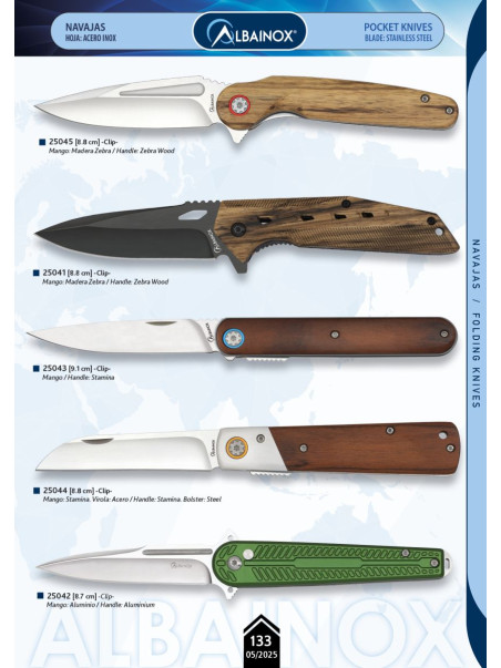 25045 Navaja con hoja de acero inox, mango en zebra, atornillada, sistema de cierre línea de bloqueo, con clip, tamaño 8,8 cm.