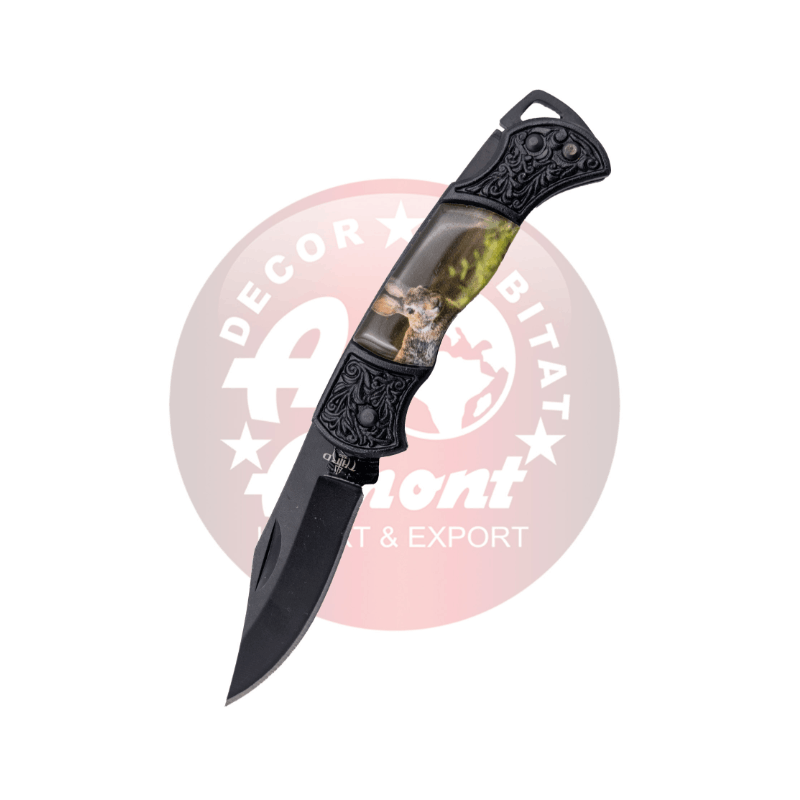 Pack de 24 navajas Third N191R hoja de 5,6 cm acabado en negro, mango con virolas negras decoradas y fotografía de conejo. Ref. N191R