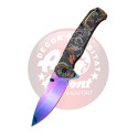 Navaja Third K1930M, sistema de apertura «Ball bearing» apertura por rodamiento de bola. Mango de Aluminio con imprimición 3D de calavera a una cara la otra está bañada en titanio magenta brillante, hoja de acero 420 de 10.4 cm bañada en titanio magenta brillante. Con clip. Ref. K1930M