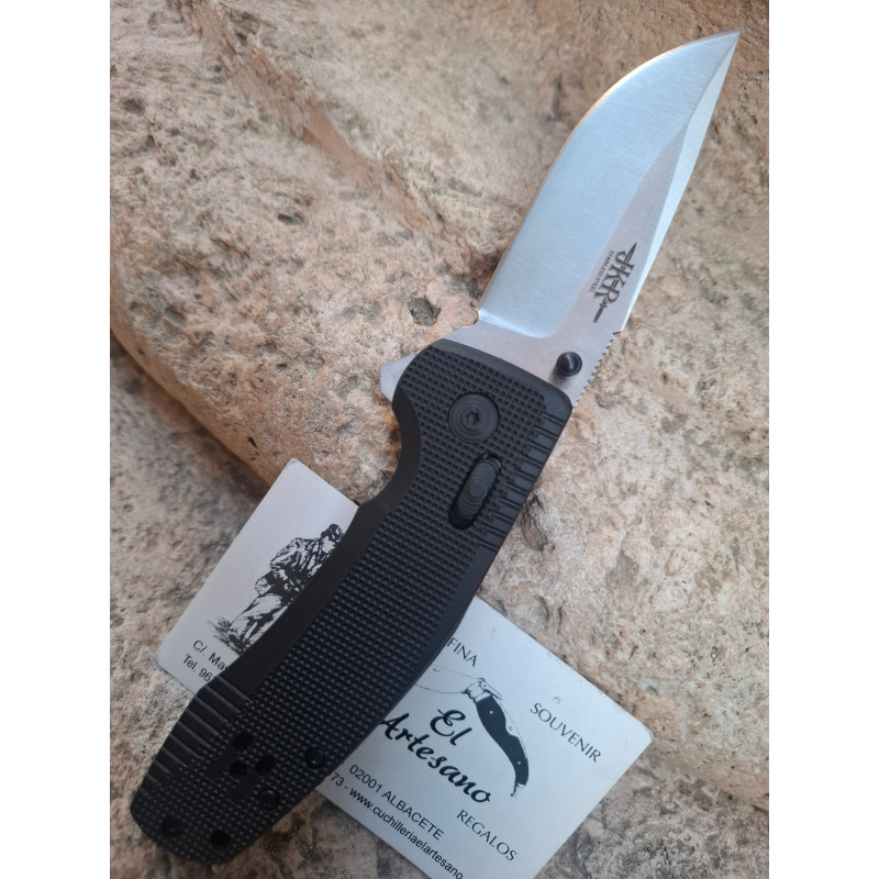 Navaja joker táctica negra, hoja acero 3cr13mov, con tetón en la hoja, mango de nylon negro, tamaño hoja 8,5 cm, tamaño mango 11,5cm, sistema de cierre cierre axis o de eje, peso 135gr, con clip